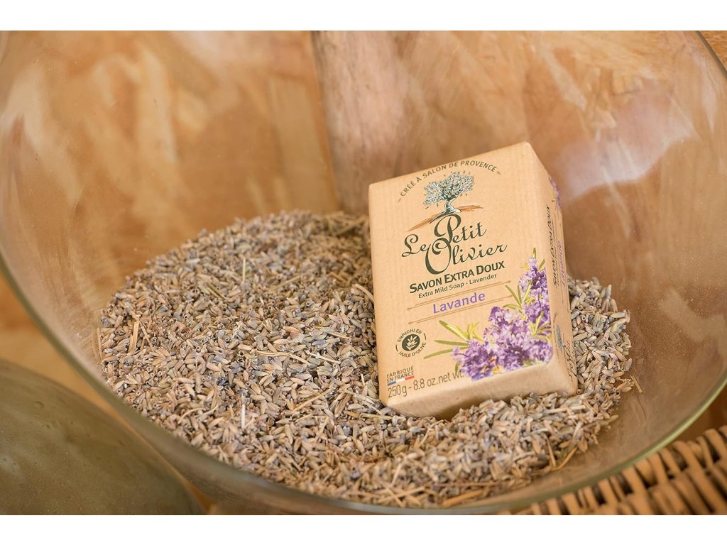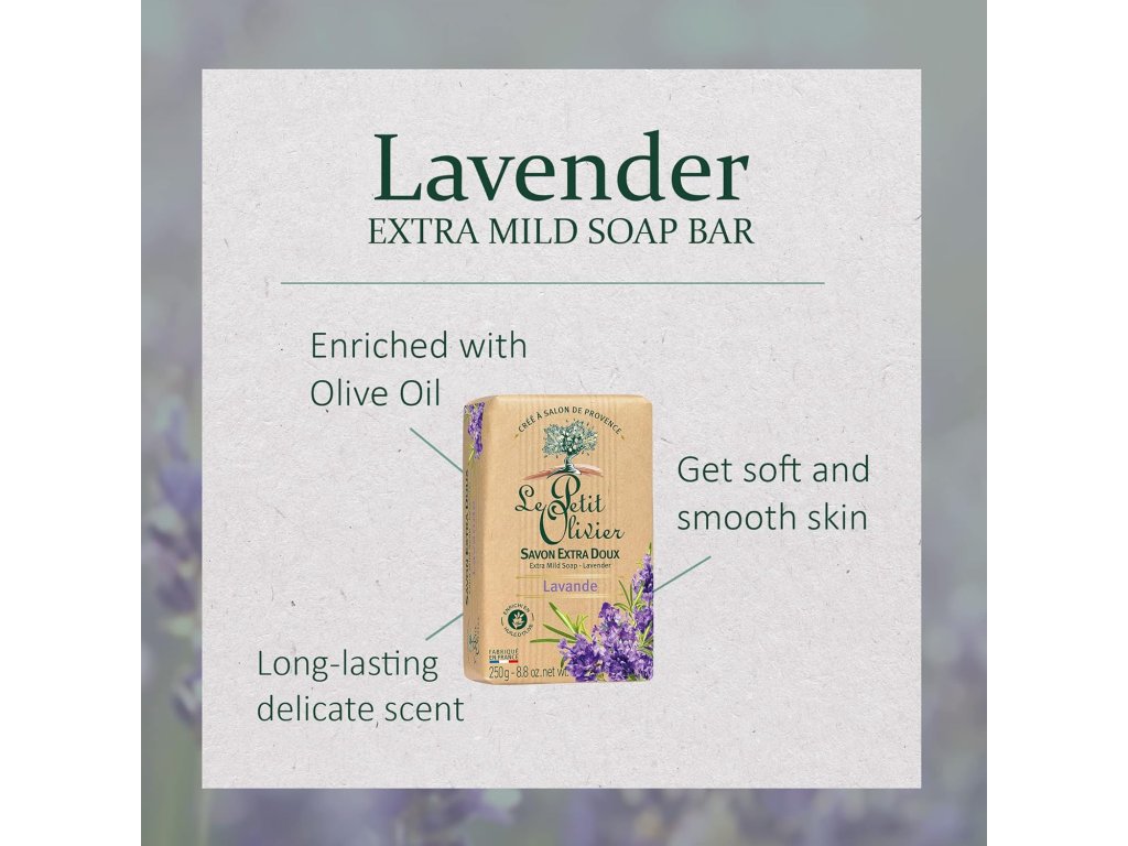 Jedinečné mýdlo vydávající jemnou levandulovou vůni. Toto tuhé mýdlo, obohacené o přírodní výtažky a olivový olej z vlastní továrny Le Petit Olivier, jemně čistí vaši pokožku. Toto extra jemné mýdlo zahalí vaši pokožku do jemného závoje a zanechá za sebou jemnou vůni. Jeho vůně pocházejí z oblasti Grasse (světové hlavní město parfémů) a přenesou vás do srdce Provence.