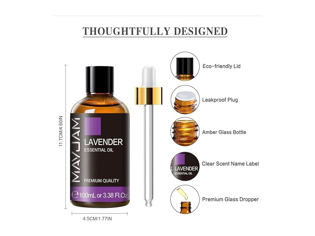 - ❤ 【Promyšlený design】 - Každý levandulový esenciální olej je plněn do 100ml lahvičky z jantarového skla, aby vůně zůstala dlouhotrvající. Dodává se také se skleněným kapátkem, které vám pomůže získat přesné množství, které si přejete.