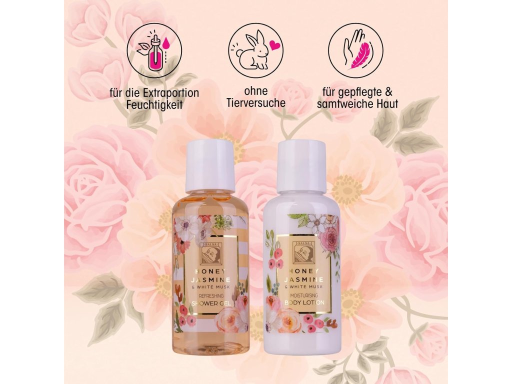 - Sladce kořeněné produkty s vůní jasmínu a medových ořechů rozmazlují pokožku dostatkem vlhkosti, díky čemuž je měkká a pružná. Všechny produkty jsou zabalené v elegantní dárkové krabičce, pečlivě zdobené dárkovou mašlí.